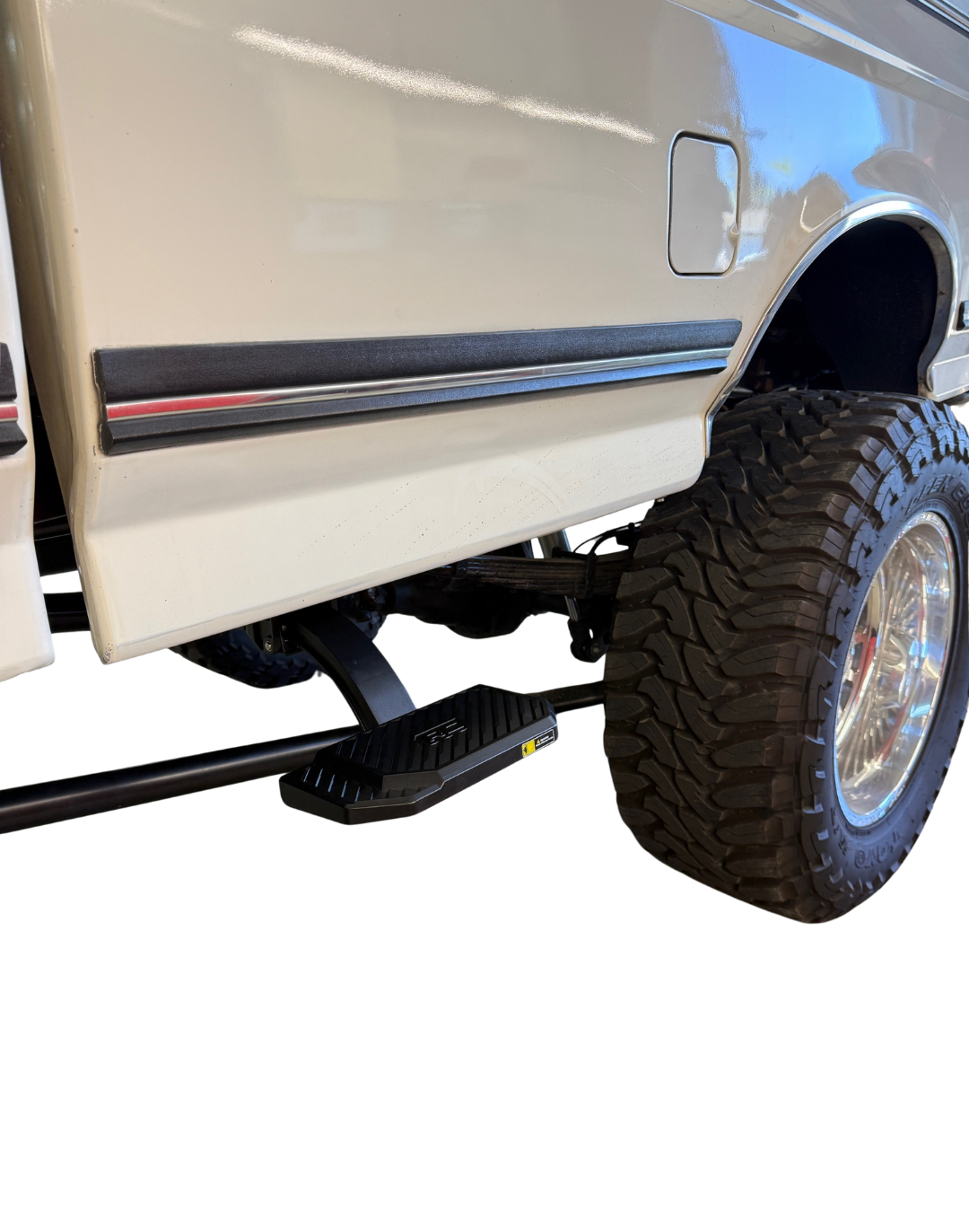 DRIVER SIDE OF THE TRUCK in front of the rear wheel. Designed specifically to fit a 1980-1997 Ford F-series long